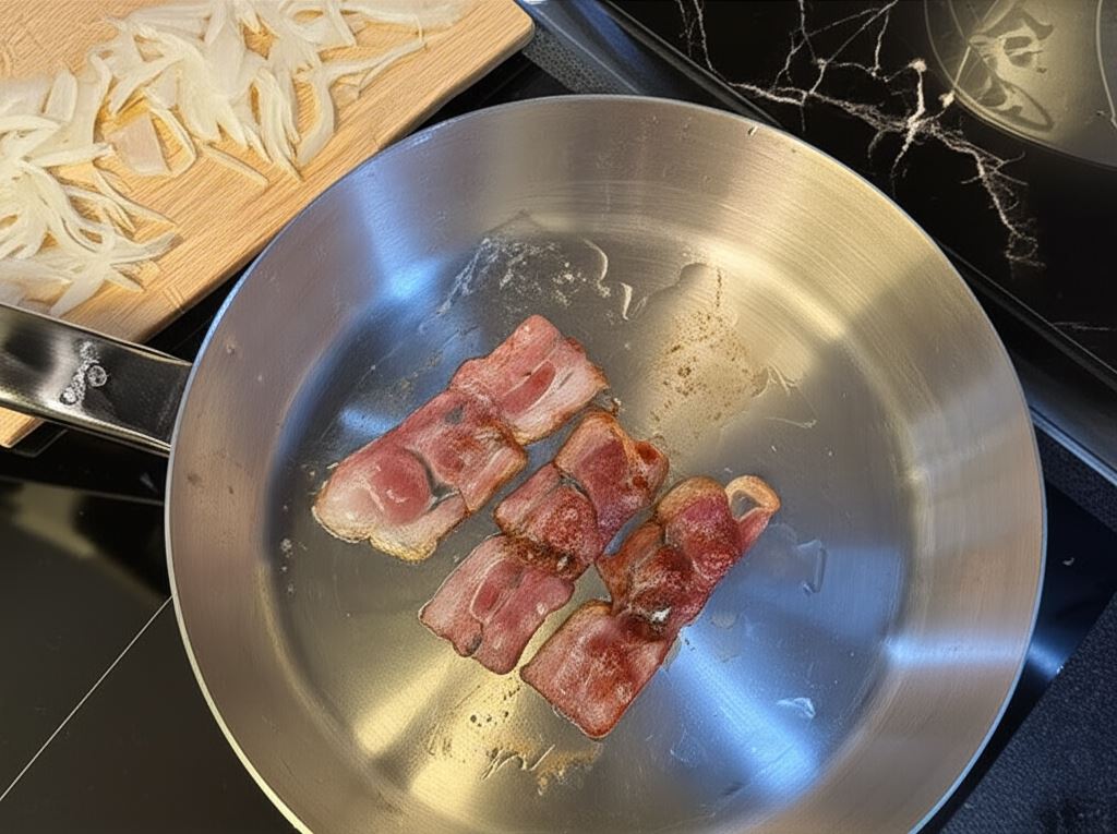 W rondlu podsmaż bekon do pożądanej chrupkości, po czym odłóż go na talerzyk obok. Przyda się na końcu. W tym samym rondlu, na wytopionej tłustości zeszklij cebulę pokrojoną w piórka.