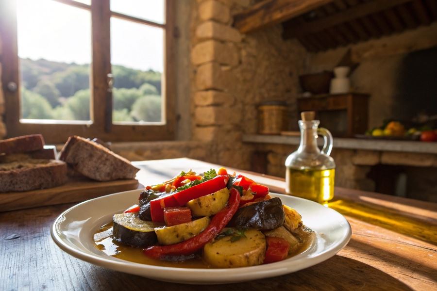 Tumbet to warstwowa kompozycja warzywna, gdzie każdy składnik zachowuje swoją integralność, jednocześnie tworząc spójną całość. Podstawę dania stanowią: