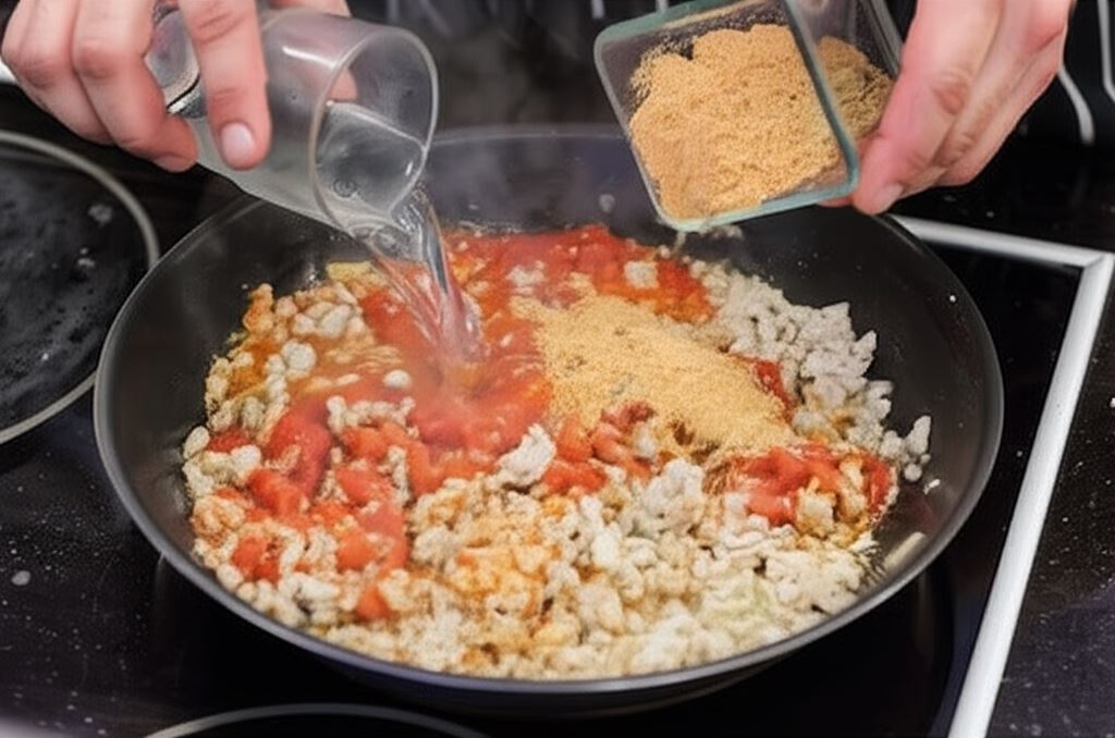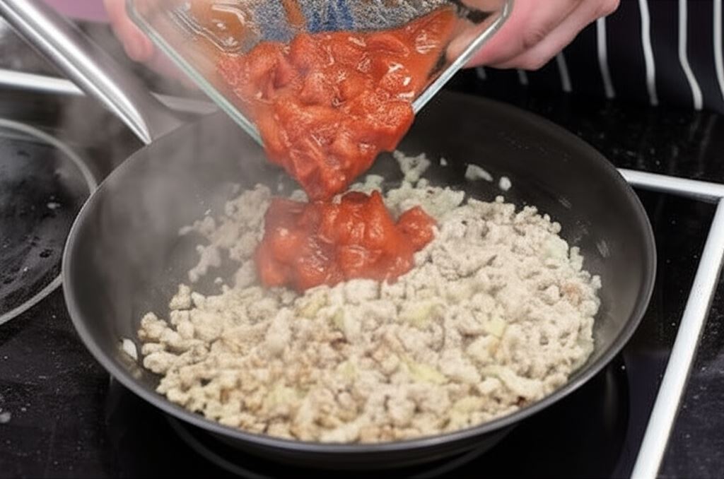 Mięso mielone z warzywami smaż przez około 8 minut, do zrumienienia. Dodaj rozdrobnione pomidory z konserwy.