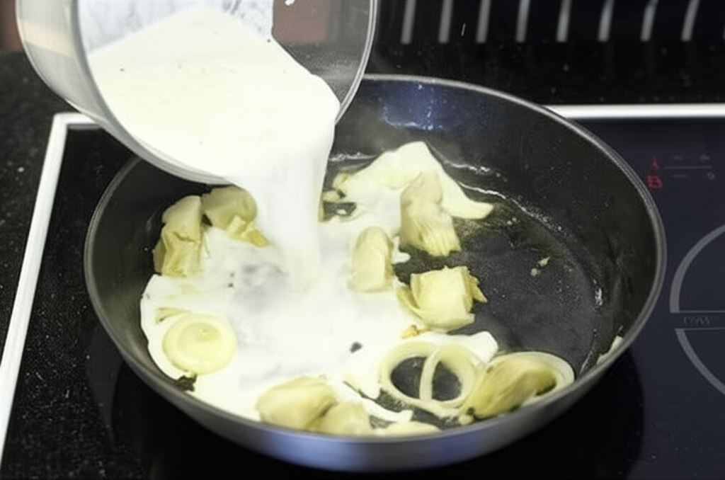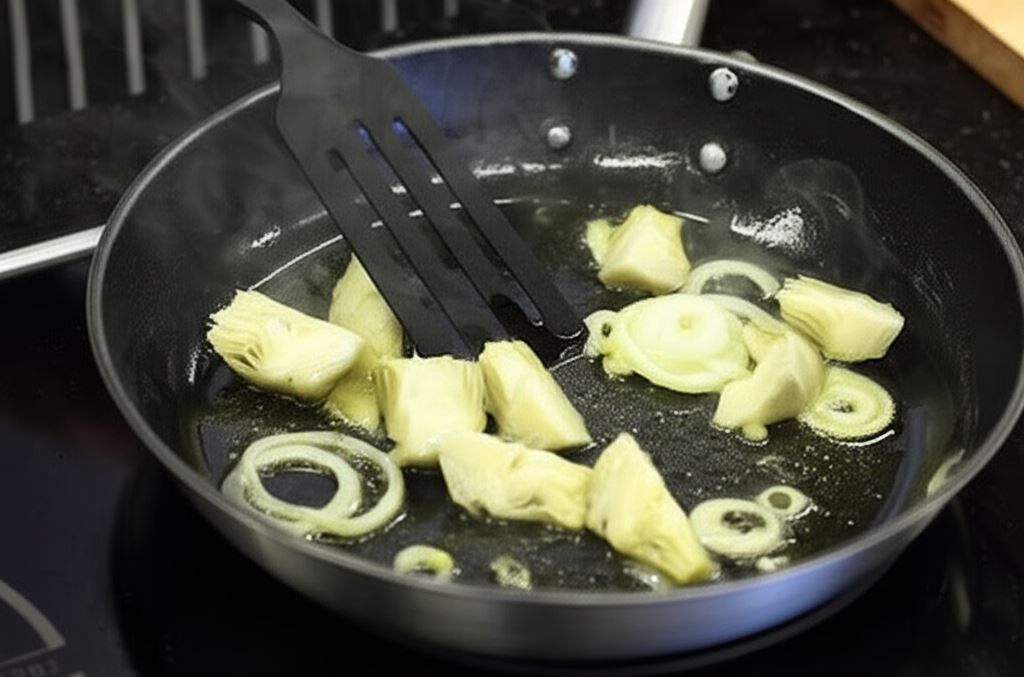 Rozgrzej na patelni odrobinę oleju z pojemnika z karczochami. Pozostały olej przelej do innego naczynia, wykorzystasz go później. Na rozgrzanym oleju zeszklij pokrojoną w plastry cebulkę. Dorzuć karczochy podzielone na cztery części.
