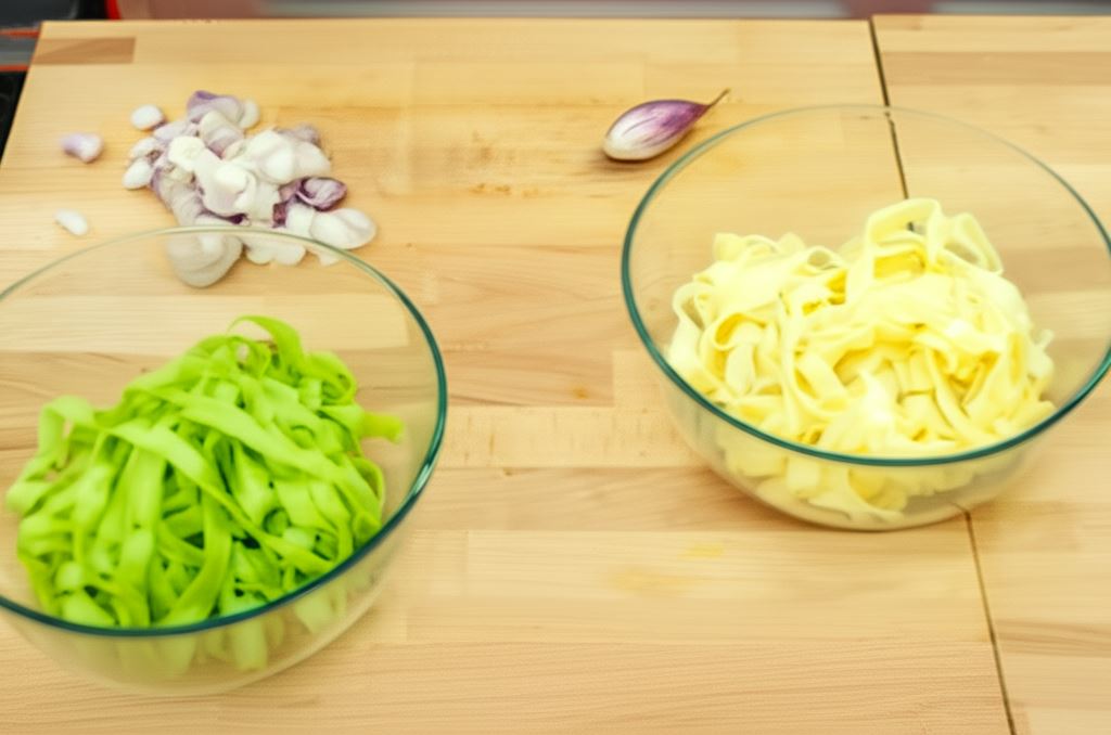Makaron ugotuj do stanu al dente. Dymkę obierz, opłucz, posiekaj w krążki i zeszklij na oliwie.