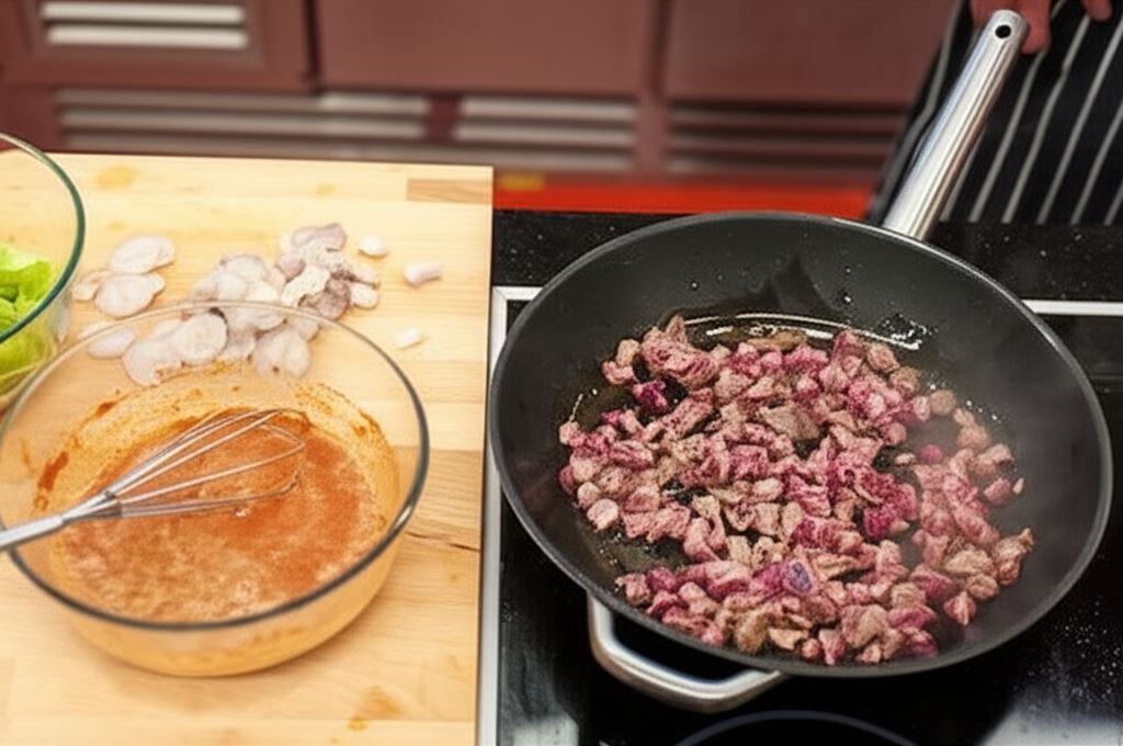 Mięso wołowe pokrój w kostkę i obsmaż na rozgrzanym oleju oliwnym.