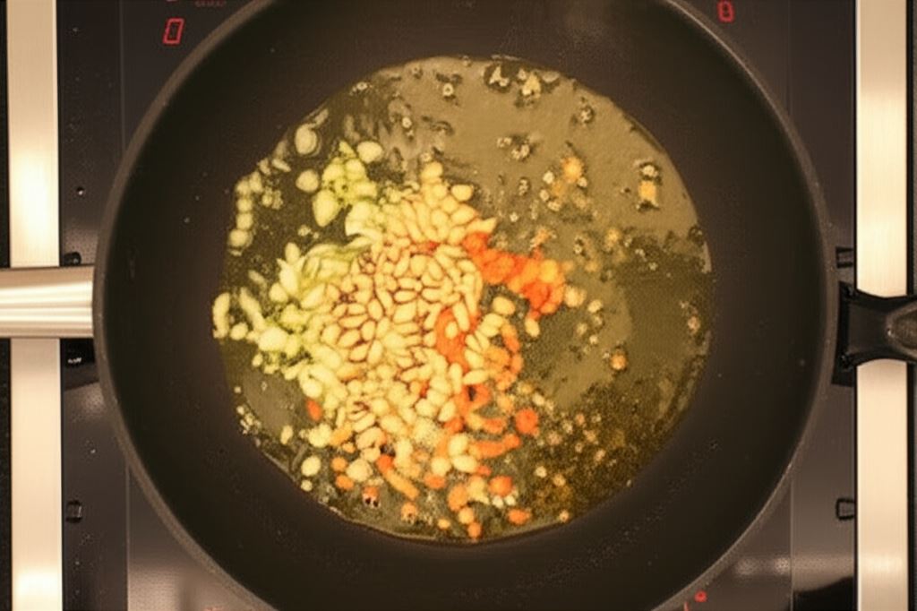 Na oliwie z oliwek zrumień posiekany czosnek i pokrojoną w kostkę paprykę chilli, wsyp orzeszki, przesmażaj je moment.
