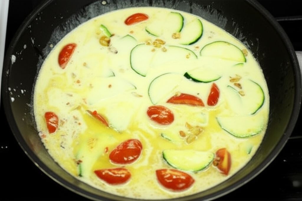 Potem wrzuć cukinię pokrojoną w półplastry i połówki pomidorków cherry, wszystko smaż około minuty, regularnie mieszając. Wlej wino, gotuj moment, aż trochę odparuje, następnie dodaj śmietanę i Bulionetkę drobiową Knorr.