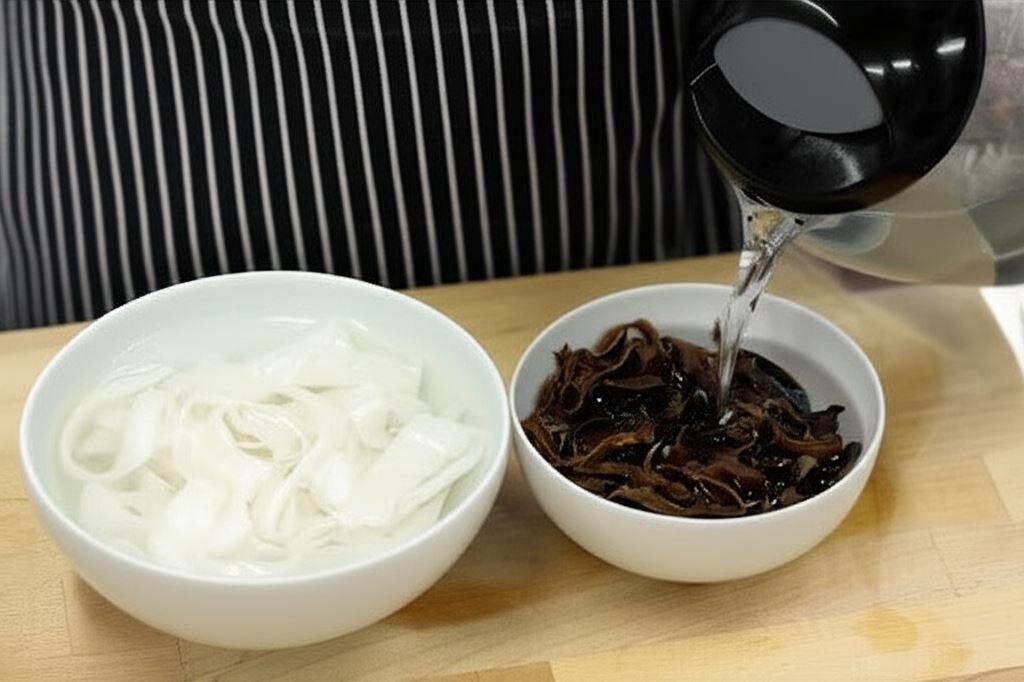 Zalej wrzącą wodą makaron ryżowy oraz grzyby mung w dwóch osobnych miseczkach, odstaw na bok na 10-15 minut, aby składniki zmiękły, a następnie odcedź je z wody.