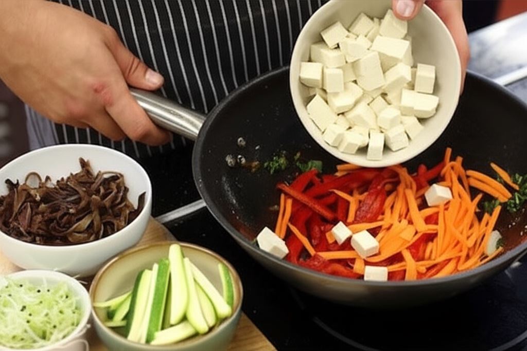 Na rozgrzanym oleju, w woku lub garnku o szerokim dnie, zrumień warzywa - kapustę, chili, imbir, paprykę, kiełki sojowe, cukinię, marchew oraz wcześniej namoczone grzyby. Dorzuć tofu.