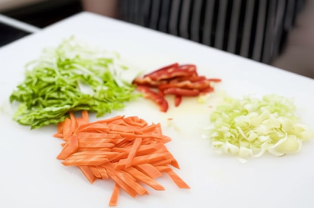 Marchewkę pokrój w słupki, pora w kostkę, a paprykę i kapustę w paski.