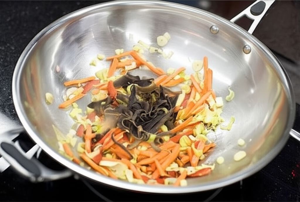 Podgrzej w woku pięć łyżek oleju. Wkrótce wsyp posiekany czosnek, paprykę i marchew. Smaż całość dwie minuty i dorzuć por. Po następnych trzech minutach smażenia dodaj grzyby mun. Smaż przez kolejne trzy minuty.