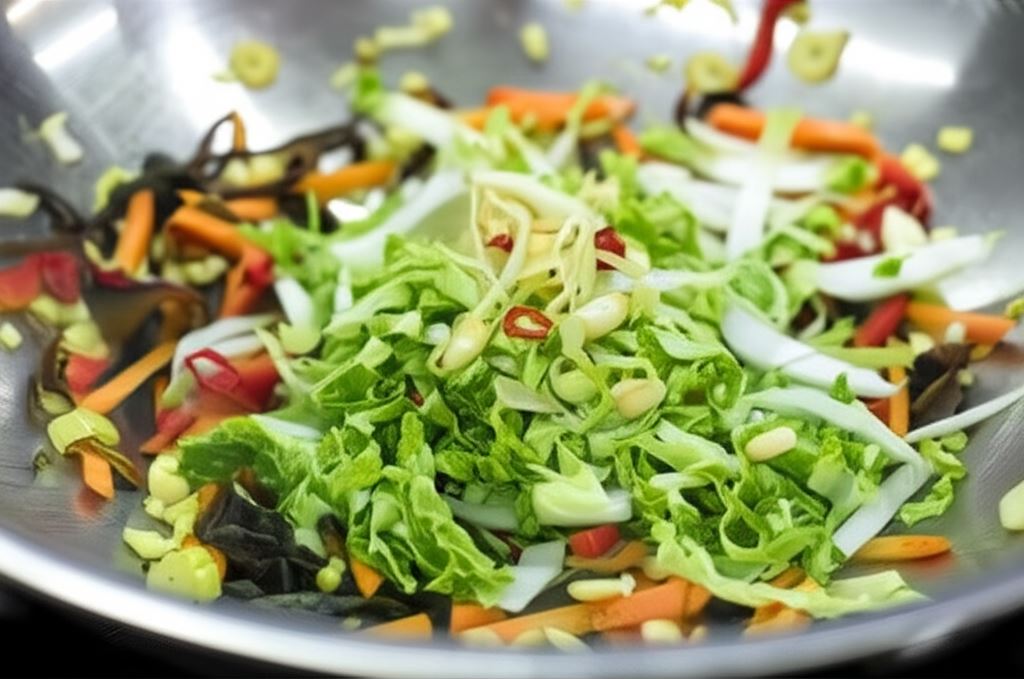 Teraz wsyp kiełki, kapustę pekińską i mięso. Smaż przez 4 minuty i dodaj posiekane chili.