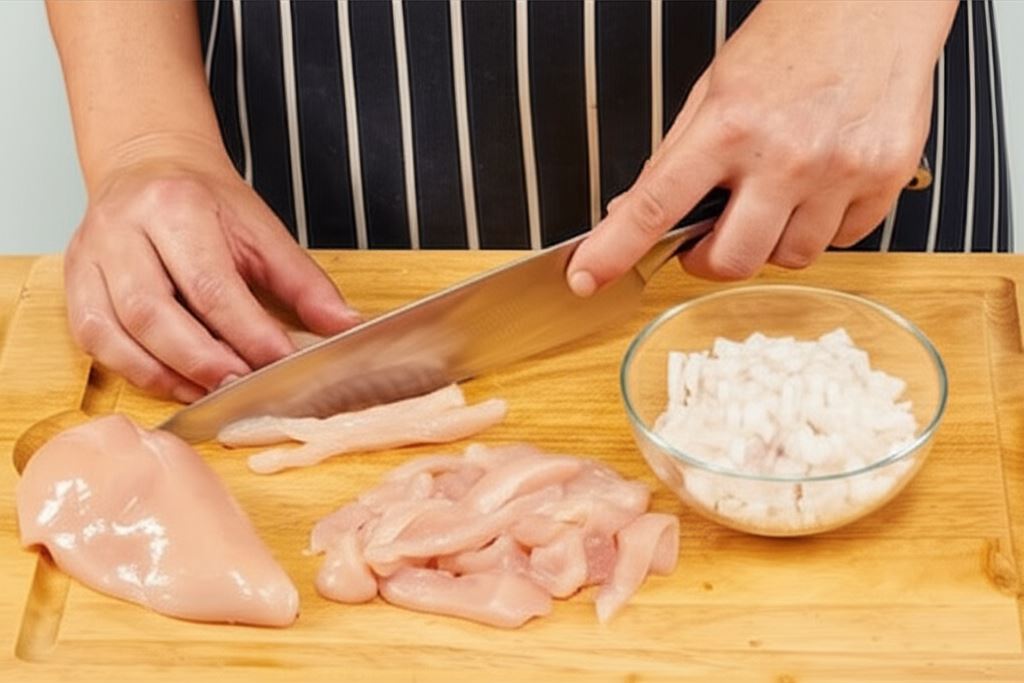 Posiekaj cebulę w kostkę. Pokrój kurczaka na paski, a grzyby w plasterki. Ugotuj makaron zgodnie z instrukcją na opakowaniu. Połącz Bulion warzywny Knorr z mlekiem i musztardą.