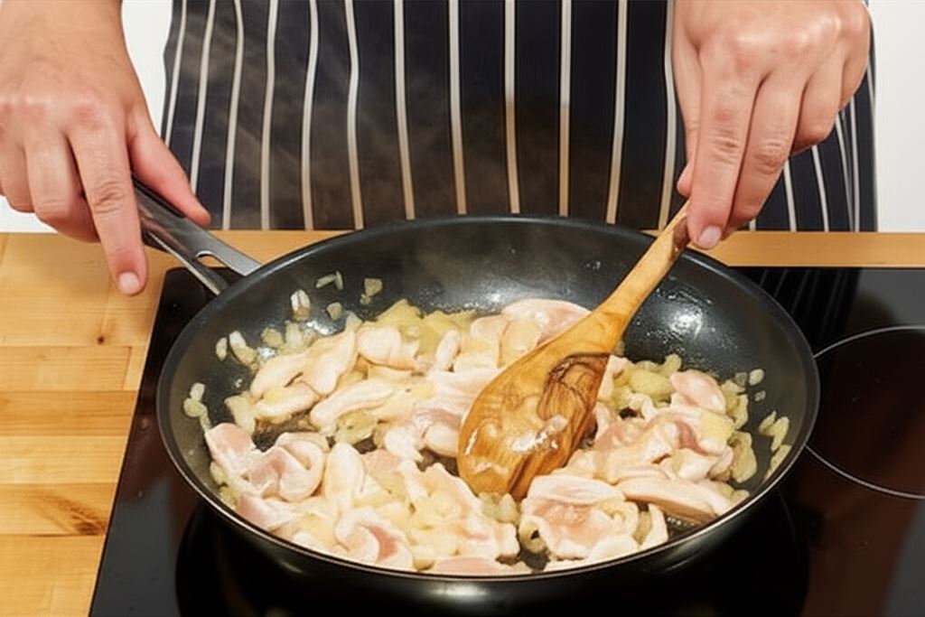 Podsmaż grzyby na 1 łyżce oleju. Odstaw na talerz, po czym usmaż oddzielnie cebulę. Dodaj kurczaka i zrumień na złoto. Wrzuć grzyby z powrotem na patelnię.