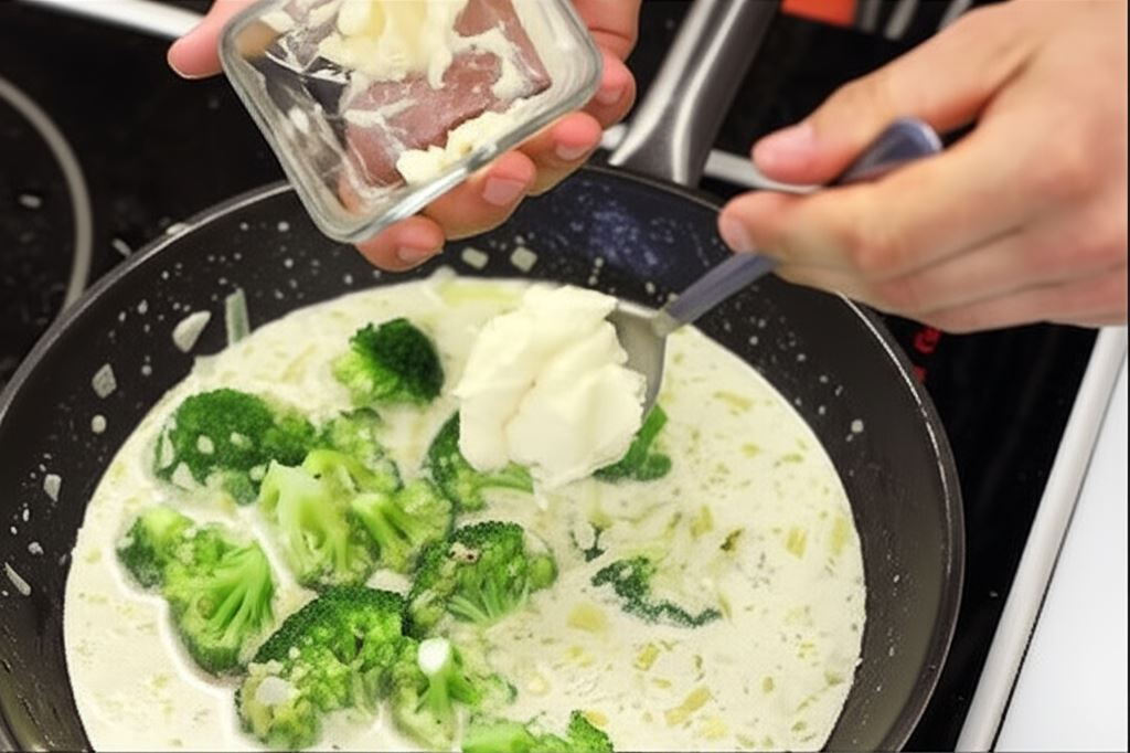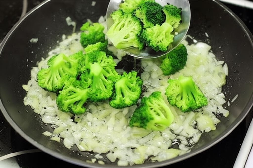 Cebulę obierz i posiekaj w małą kostkę. Potem zeszklij na oleju. Dodaj do niej ugotowanego brokuła, a następnie smaż przez 5 minut na niskim ogniu.