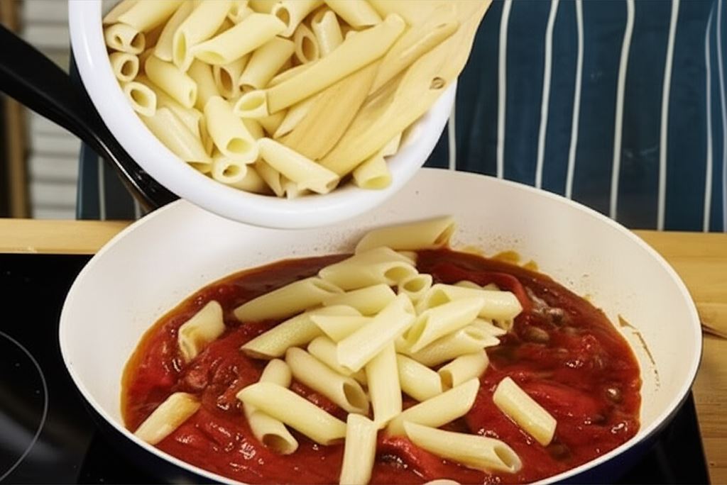 Makaron ugotuj na półtwardo. Potem odcedź go i przełóż do sosu na patelni.