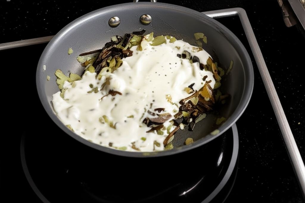 Wymieszaj fix Knorr ze śmietaną i 100 ml zimnej wody. Polej nim składniki na patelni. Gotuj całość przez moment, aż sos stanie się gęsty.