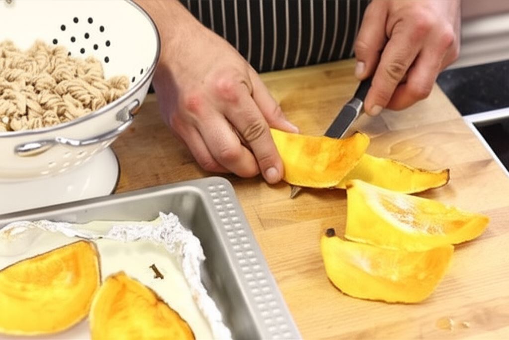 Dynię potnij na większe części, zapiekaj w piekarniku przez ok. 35 min, potem obierz i pokrój w kostkę. Makaron ugotuj al dente i odcedź.