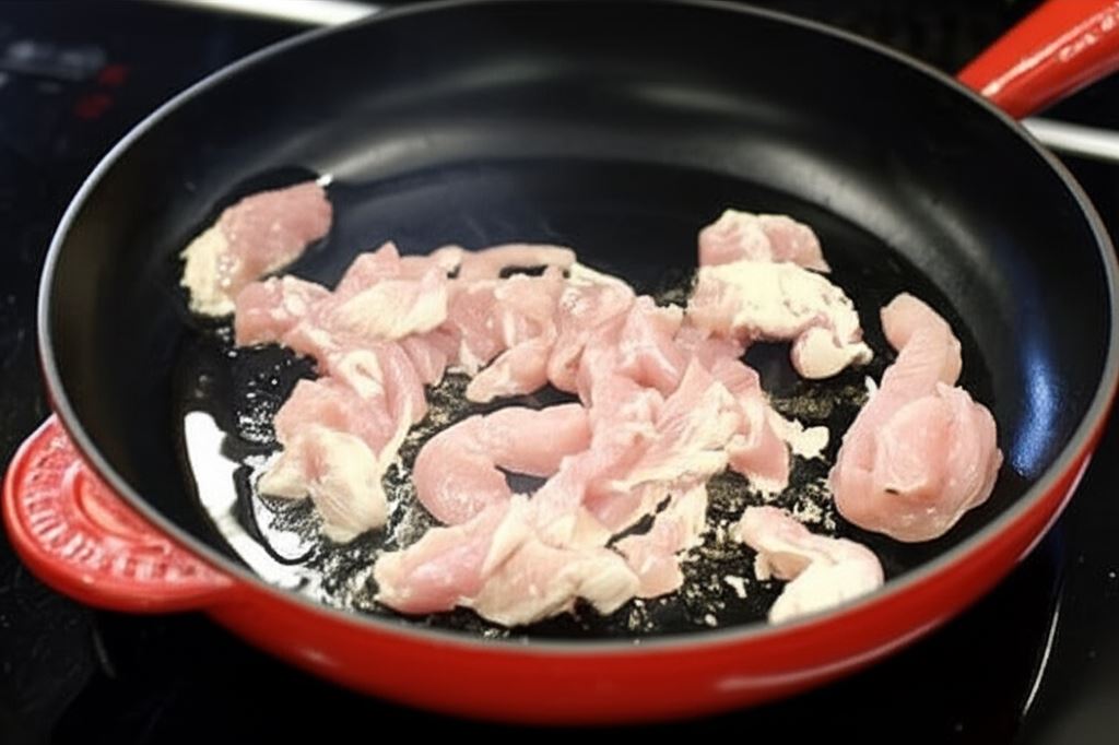 Mięso opłucz, wysusz i potnij w paski, zrumień na podgrzanej oliwie do złotego koloru.