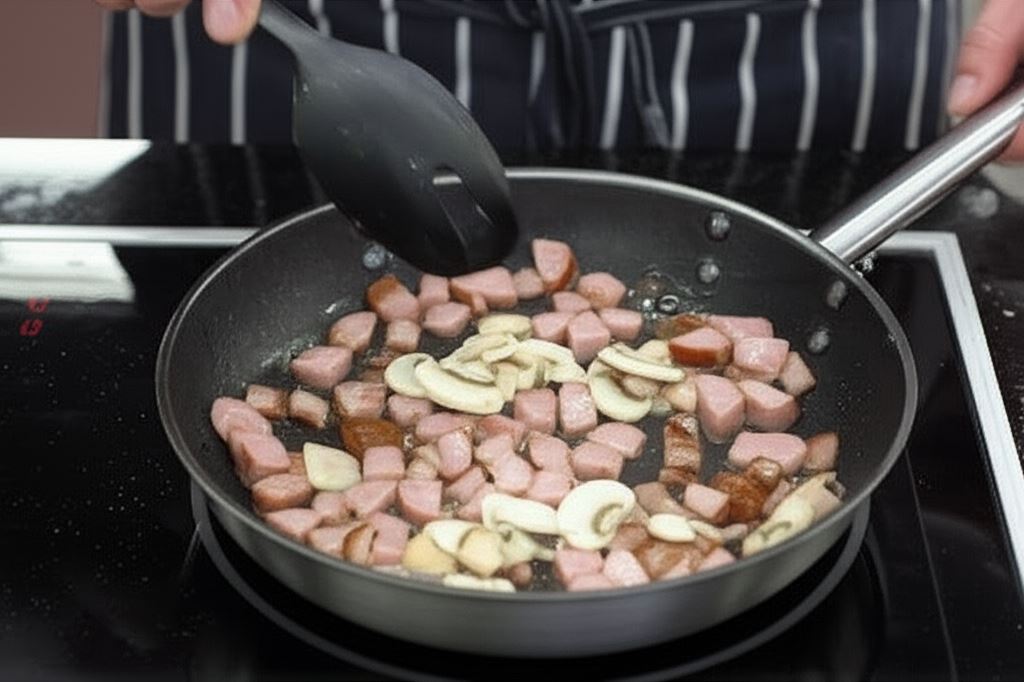 Kiełbasę potnij w kostkę i obsmaż na rozgrzanej patelni. Dorzuć pokrojone pieczarki i smaż razem przez moment.