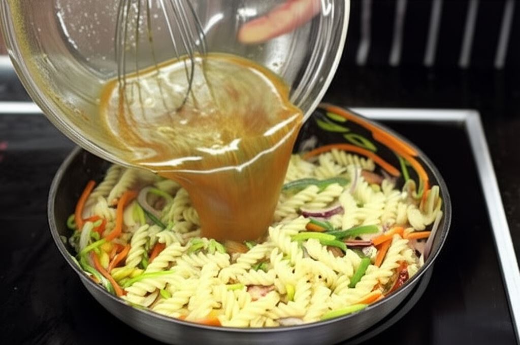 Do podsmażonych warzyw dodaj makaron, potem wlej Fix Knorr i gotuj przez kilka minut na małym ogniu. Na końcu wsyp kiełki, zamieszaj wszystko i serwuj.