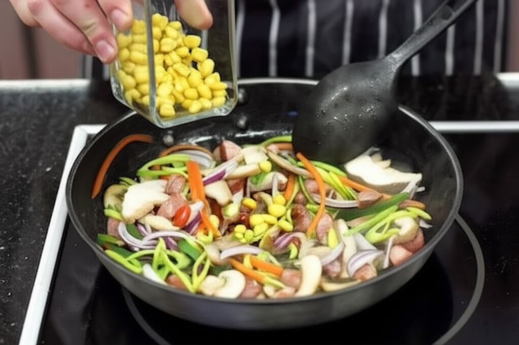 Potem dodaj do patelni z kiełbasą mieszankę warzywną i kukurydzę – smaż wszystko razem przez kilka minut.