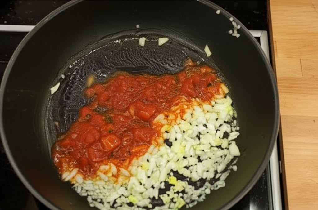 Do cebuli wsyp pokrojone pomidory z puszki razem z sokiem.