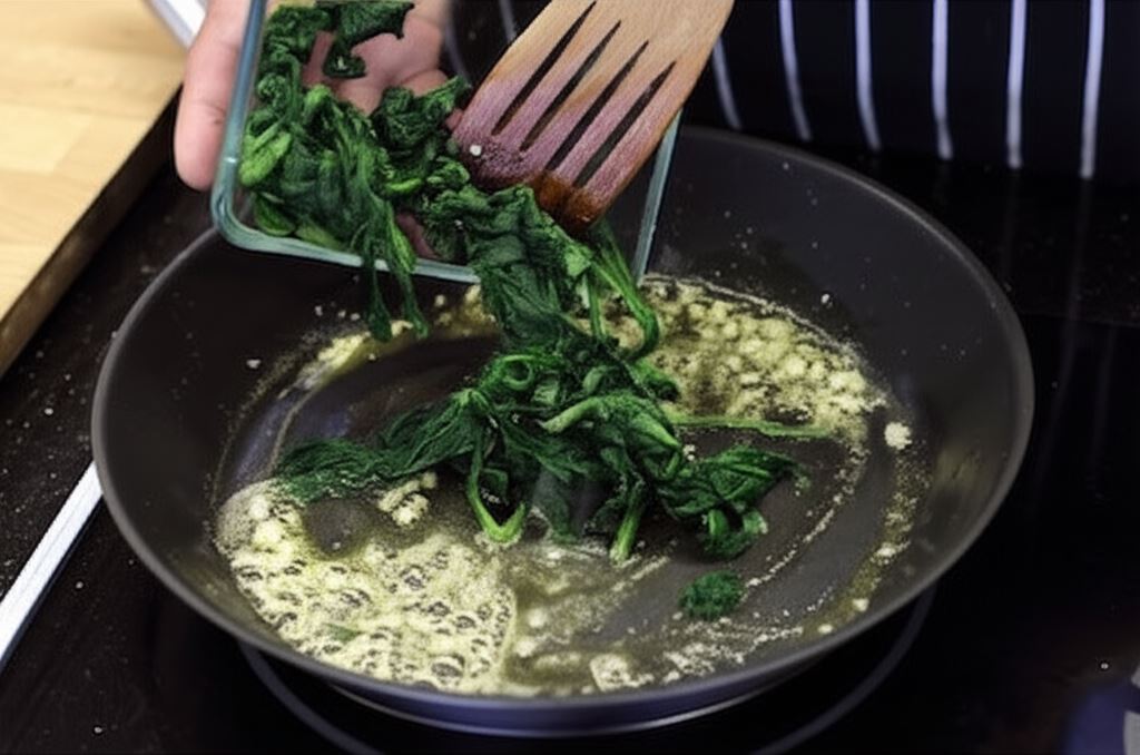 Na patelni przesmaż rozdrobniony czosnek z odrobiną margaryny. Po momencie dodaj szpinak. Smaż przez 1 minutę.