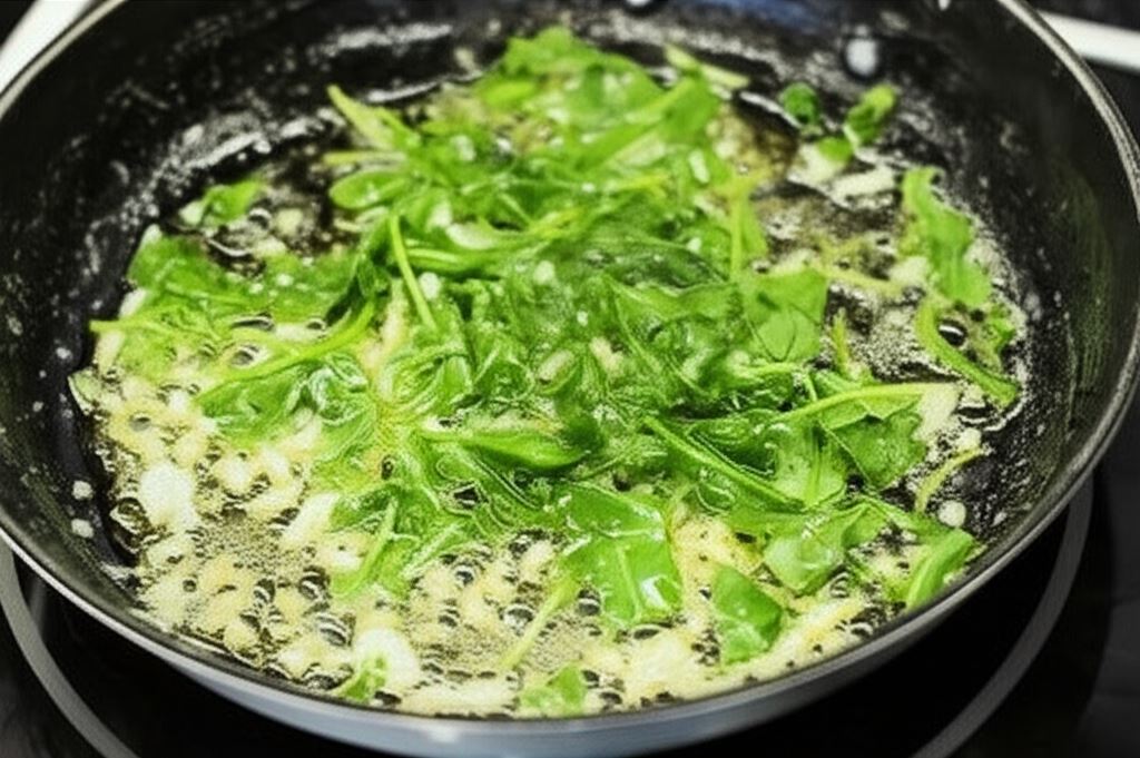 Starannie opłucz szpinak i posiekaj go. Rozgrzej masło na patelni, zeszklij na nim posiekaną cebulę i czosnek. Dodaj opłukany i pokrojony szpinak. Smaż przez 2-3 minuty.