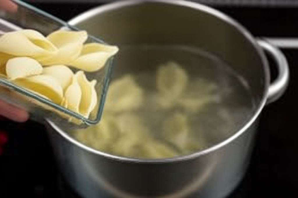 Wrzuć muszle makaronowe do wrzącej wody, gotuj przez 2-3 minuty, następnie przelej zimną wodą i ułóż na tacce, aby odciekły z nadmiaru wody.