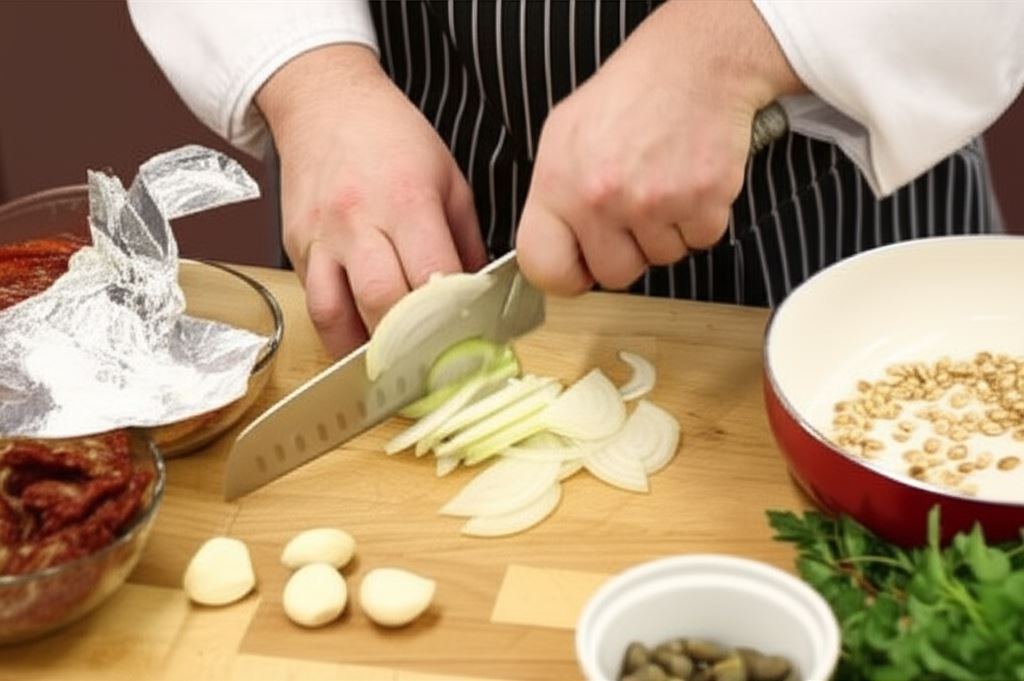 Posiekaj czosnek, natkę pietruszki, kapary, suszone pomidory. Na tarce zetrzyj marchew i seler, a cebulę drobno pokrój. Orzeszki zrumień na suchej patelni do złotego koloru.