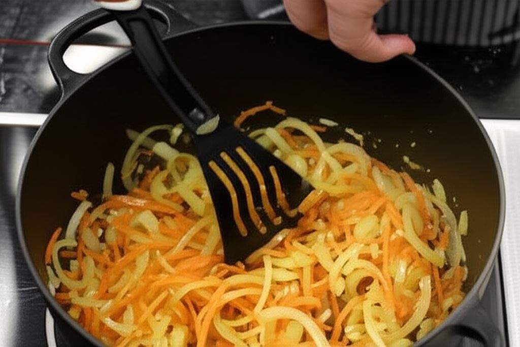 Na rozgrzanej oliwie w garnku zrumień cebulę, marchew i selera, dorzuć czosnek i podsmaż jeszcze moment, po czym zalej całość pomidorami z puszki. Wszystko gotuj na małym ogniu przez minimum 10-15 minut, od czasu do czasu mieszając.