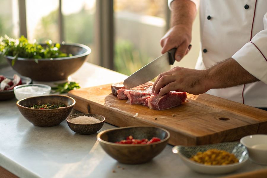 Ręczne siekanie wołowiny to tradycyjna metoda przygotowania kotletów, która nadaje im wyjątkową teksturę. Aby przygotować kotlety z ręcznie siekanej wołowiny, potrzebujesz ostrego noża szefa kuchni i deski do krojenia. Mięso wołowe (najlepiej łopatka lub udziec) pokrój najpierw w cienkie plastry, a następnie w paski, by finalnie posiekać je na drobne kawałki.