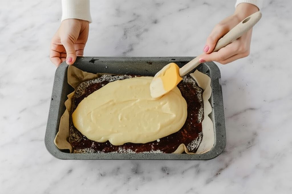Budyniową masę nakładamy na warstwę konfitury i nakrywamy drugim blatem makowym. Nasączamy go resztą herbaty.