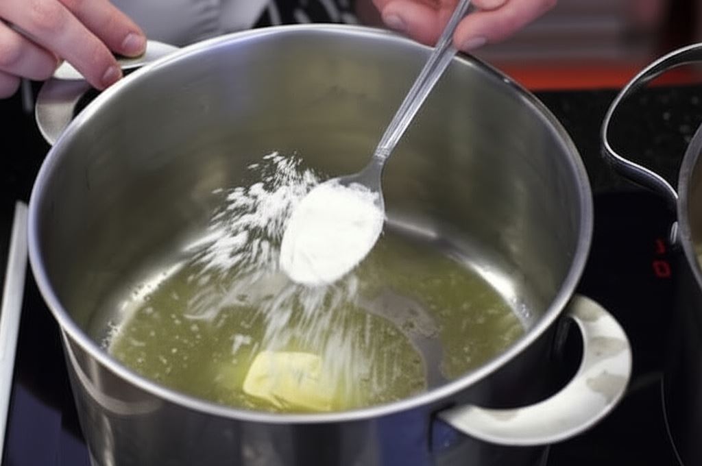 Roztop tłuszcz na patelni i przyrumień mąkę.