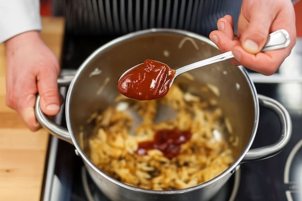 Na rozgrzanym oleju w garnku zrumień cebulę pokrojoną w drobną kostkę. Kiedy się zeszkli wsyp cukier i smaż do momentu karmelizacji. Potem dodaj goździki, ziele angielskie, starte na tarce jabłko oraz cynamon i ketchup Hellamann's.