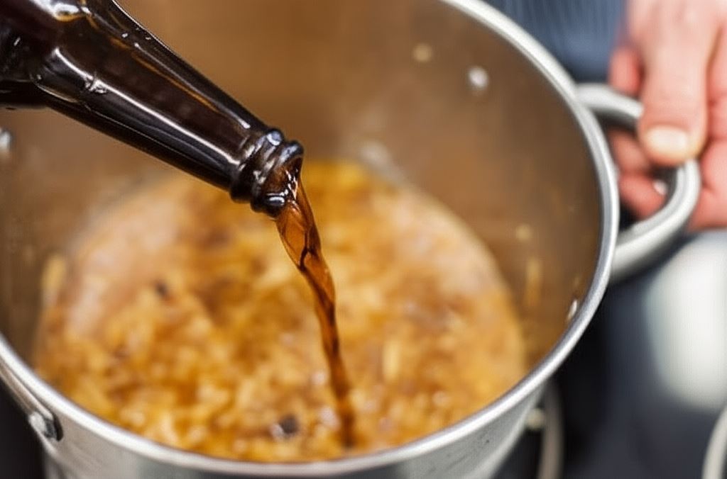 Całość smaż przez moment w rozgrzanym cukrze, następnie dodaj sok jabłkowy i piwo. Gotuj wszystko razem, aż uzyskasz dość gęstą marynatę.