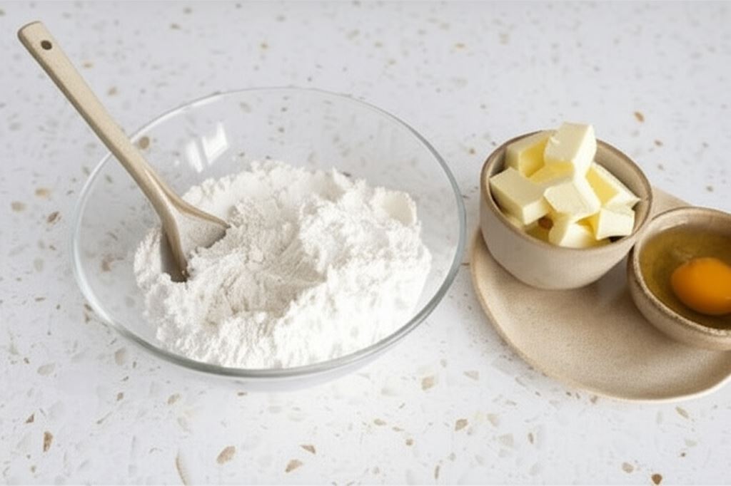 Do przesianej mąki pszennej dodaj cukier puder. Zamieszaj. Dołóż pokrojone na drobniejsze części masło, a potem jajko. Wyrób ciasto. Zawiń w folię i umieść w lodówce do ochłodzenia na około 60 minut.