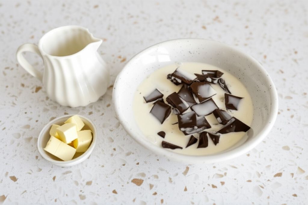 Podgrzej śmietankę. Posiekaną na drobniejsze części czekoladę deserową zalej gorącą śmietanką. Poczekaj moment, po czym wymieszaj. Dodaj masło i wszystko połącz. Odstaw na moment do ostygnięcia.