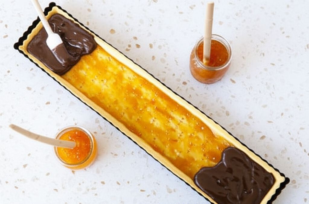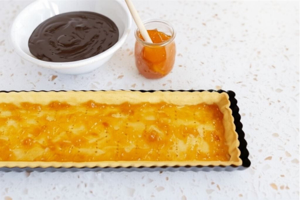 Nałóż warstwę czekoladowej masy na konfiturę morelową.