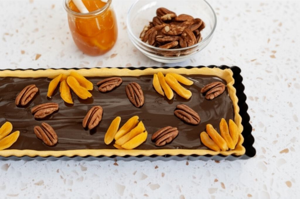 Przygotowanie mazurka rozpoczyna się od zagniecenia kruchego ciasta z mąki, masła, cukru pudru i jajka. Po schłodzeniu w lodówce, ciasto trafia do piekarnika, gdzie nabiera złocistego koloru. Na upieczony i wystudzony spód nakładamy warstwę konfitury morelowej, a następnie pokrywamy ją aksamitną masą czekoladową przygotowaną ze śmietanki, czekolady deserowej i masła. Całość dekorujemy orzechami pekan i morelami.
