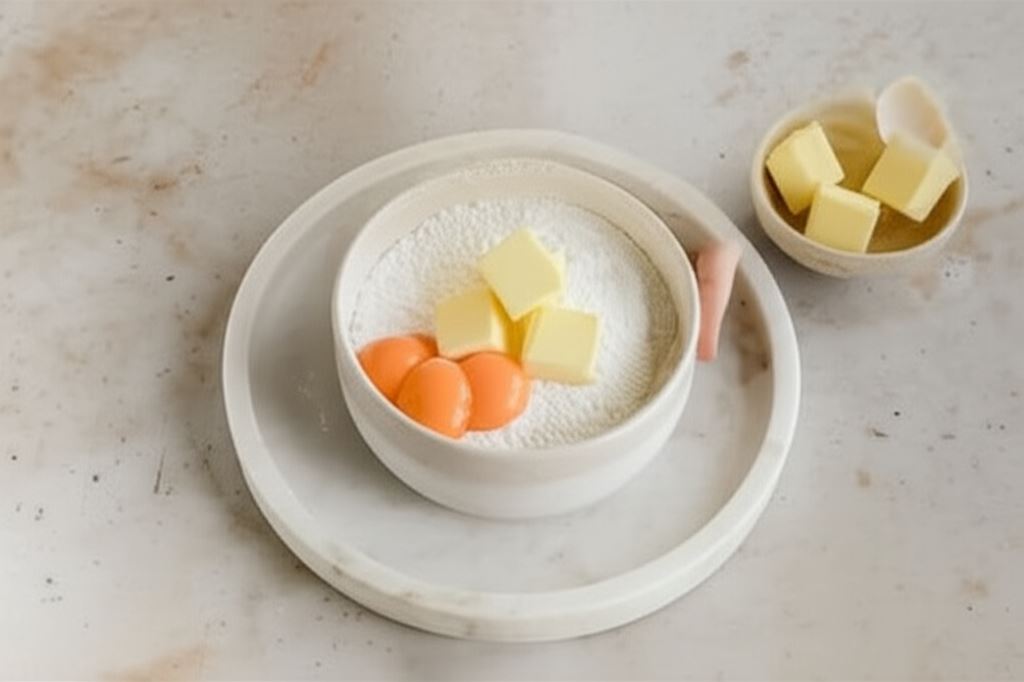 Przesiewamy mąkę do miski. Wsypujemy proszek do pieczenia i cukier. Potem zimne masło pokrojone w kostkę oraz trzy żółtka.