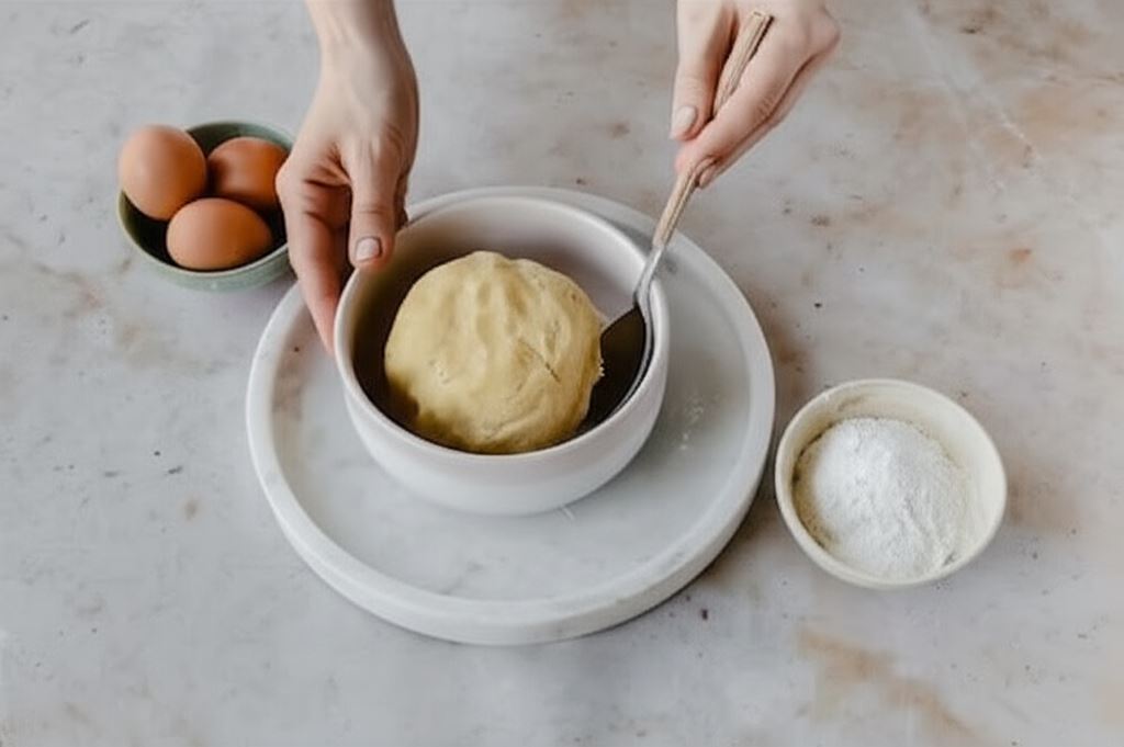 Wyrabiamy ciasto i kształtujemy z niego kulę. Odkładamy na 30 min do lodówki.
