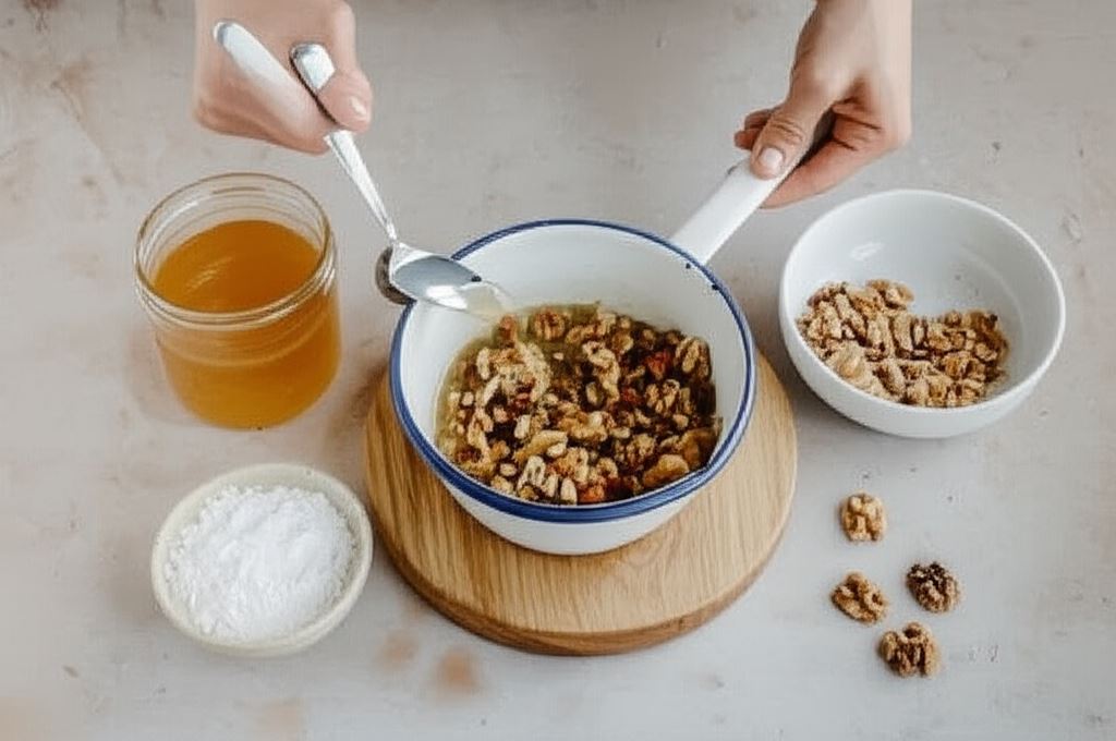 W garnuszku topimy masło z cukrem i miodem. Wsypujemy orzechy i dokładnie mieszamy.
