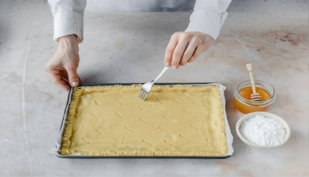 Formę wyścielamy papierem do pieczenia. Rozkładamy na niej równomiernie ciasto i nakłuwamy widelcem.