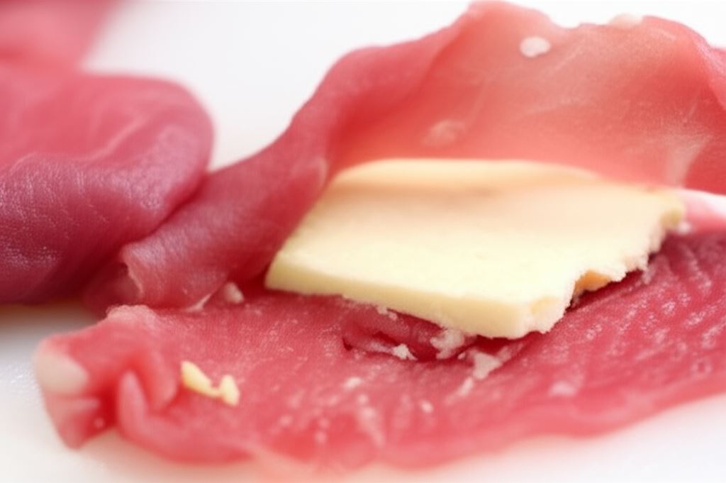 Polędwiczki potnij na plastry grubości 3 cm, po czym rozbij tłuczkiem na bardzo cienkie plastry. Na każdą połowę plastra umieść plaster oscypka i zawiń w kopertę (zaginając brzegi do spodu).
