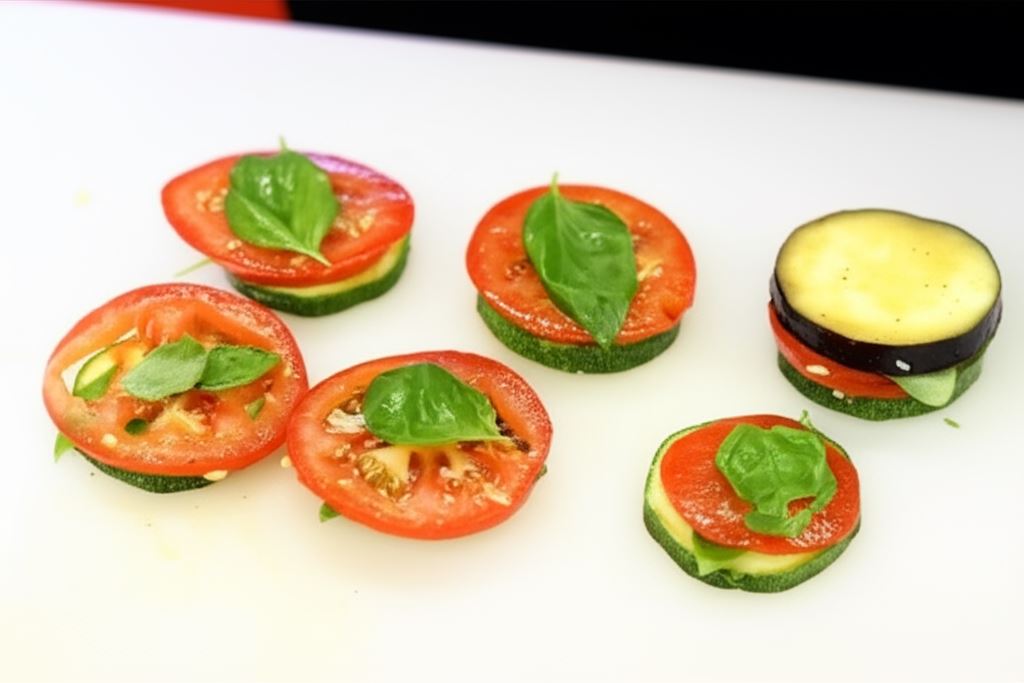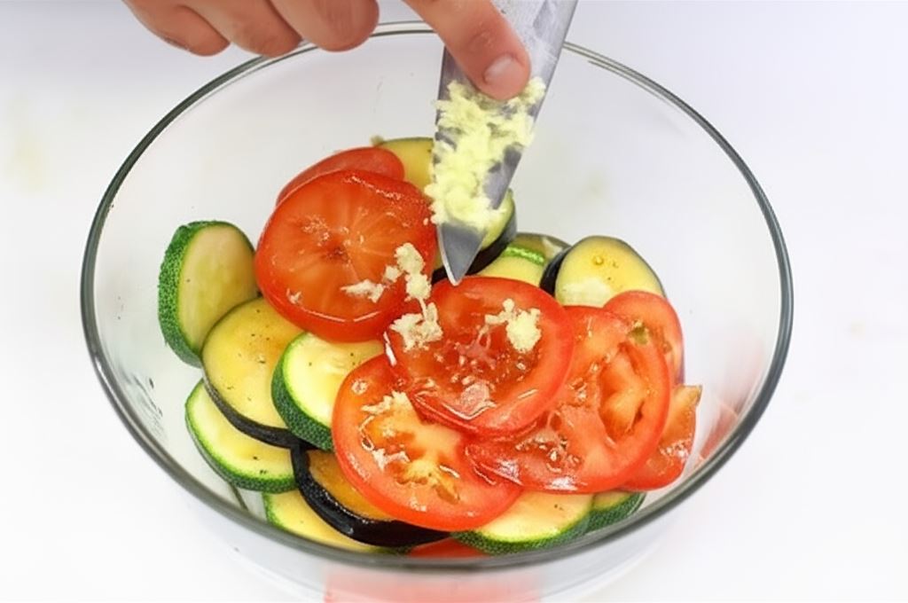 Warzywa potnij na plastry, posyp przyprawą Knorr, wsyp posiekany czosnek i wlej oliwę.