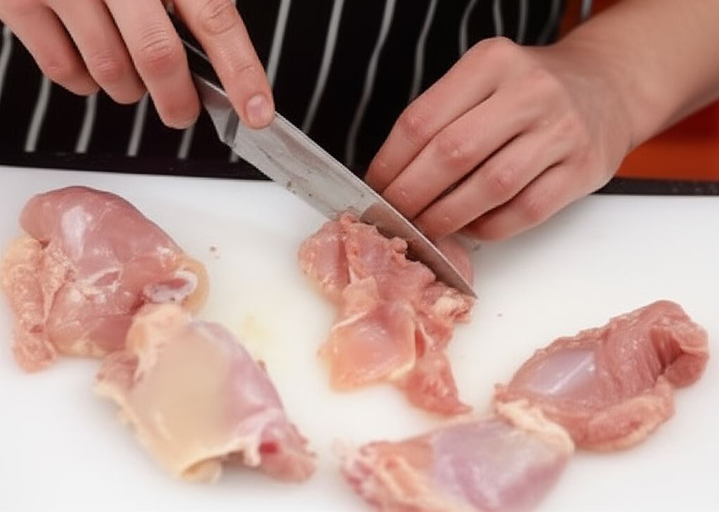 Nóżki kurczaka opłucz i osusz. Zdejmij skórę i kości, zostawiając jedynie mięso.