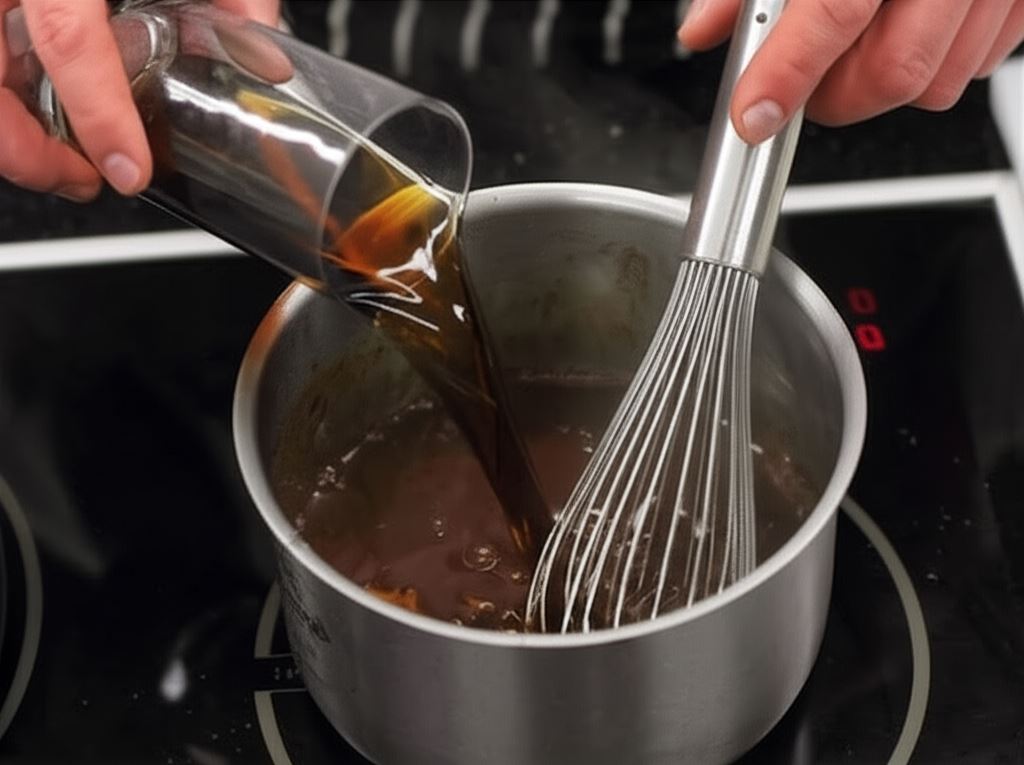 Do rozgrzanego płynu wsyp połamaną czekoladę i mieszaj aż do momentu, gdy się rozpuści. Potem dodaj colę.