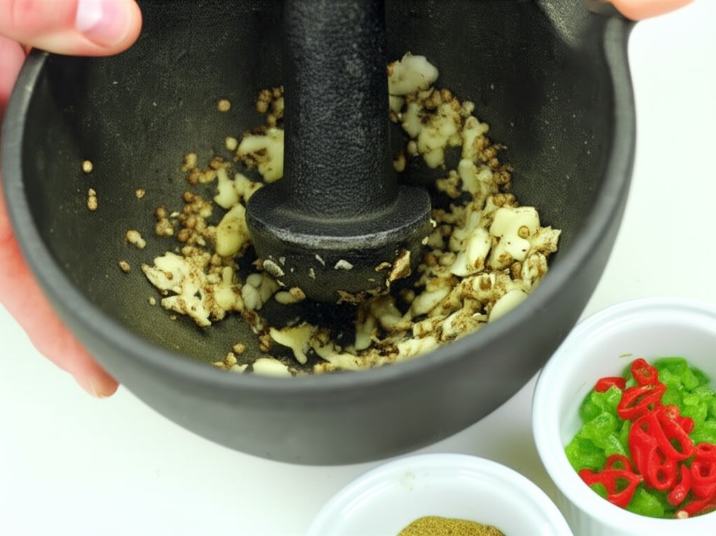 Rozgnieć w moździerzu ziarna kolendry i czosnek. Dodaj do marynaty razem z kuminem oraz posiekanymi papryczkami chili.