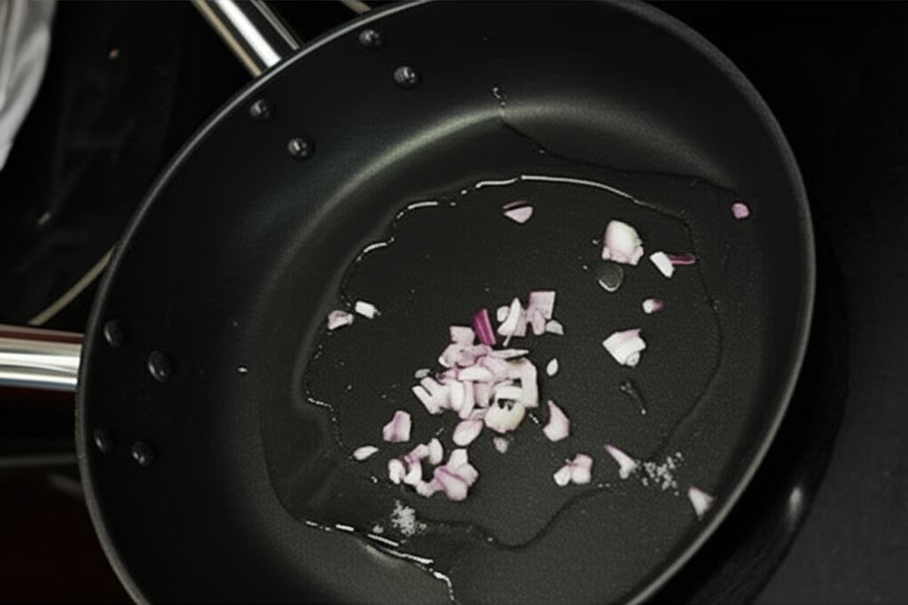 Cebulę i papryki pokrój w kostkę i przesmaż na patelni.