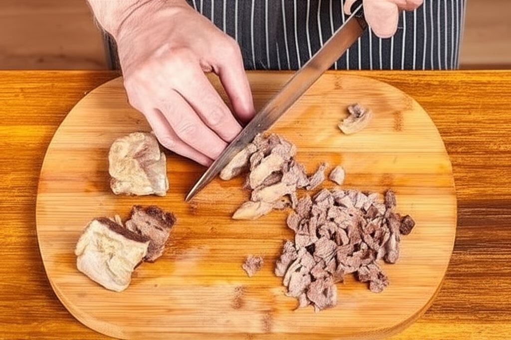Ugotuj wywar z wołowiny, włoszczyzny i kostki Knorr. Gdy mięso zmięknie, odcedź rosół i zachowaj do wykorzystania w innej potrawie. Mięso wystudź, a potem pokrój na małe kawałki.