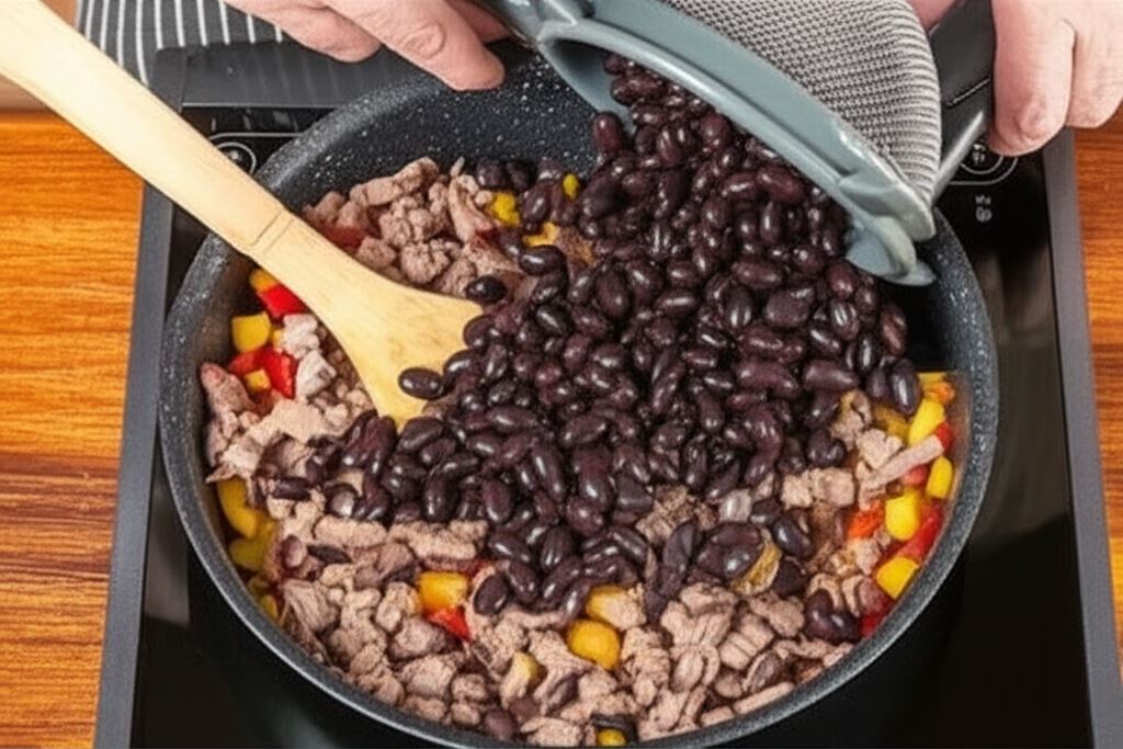 Odsącz fasolę z puszki. Papryki posiekaj w drobną kostkę i zrumień na patelni. Dorzuć pokrojone mięso wołowe, fasolę, przyprawę Adobo Knorr i smaż wszystko kilka minut aż składniki się zmieszają.